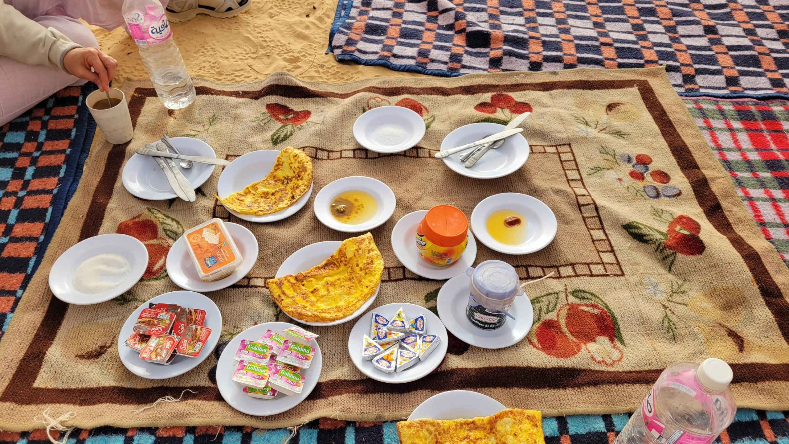 Man wacht morgens mit dem Duft vom Lagerfeuer auf und darf sich nach der gemeinsamen Meditation nicht nur auf den darauf köchelnden Kaffee oder Tee freuen, sondern auch auf die offenen Arme der Beduinen, ihrem fröhlichen Lächeln und auf den liebevoll eingedeckten Frühstücks- „Tisch“. Ganz besonders in Erinnerung bleibt mir das in Glut und Sand gebackene Brot.