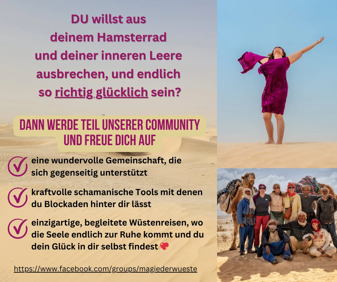 Die Wüstenreise bietet eine transformative Erfahrung, die dir hilft, dich von den alltäglichen Ablenkungen zu lösen und dich ganz auf dich selbst zu konzentrieren. Du wirst tief in deine innere Welt eintauchen, alte Wunden heilen und neue Kraft und Klarheit finden.